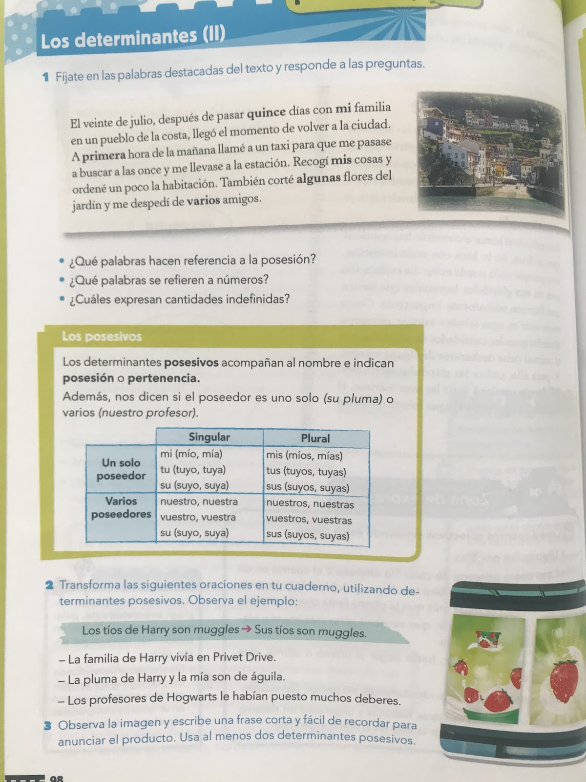 *Ya vimos los artículos (determinados e indeterminados ) y los demostrativos ( que indican lo cerca o lejos que están las cosas: esta, esa,aquella...). Pues bien , hoy toca aprender sobre los determinantes posesivos, numerales e indefinidos.